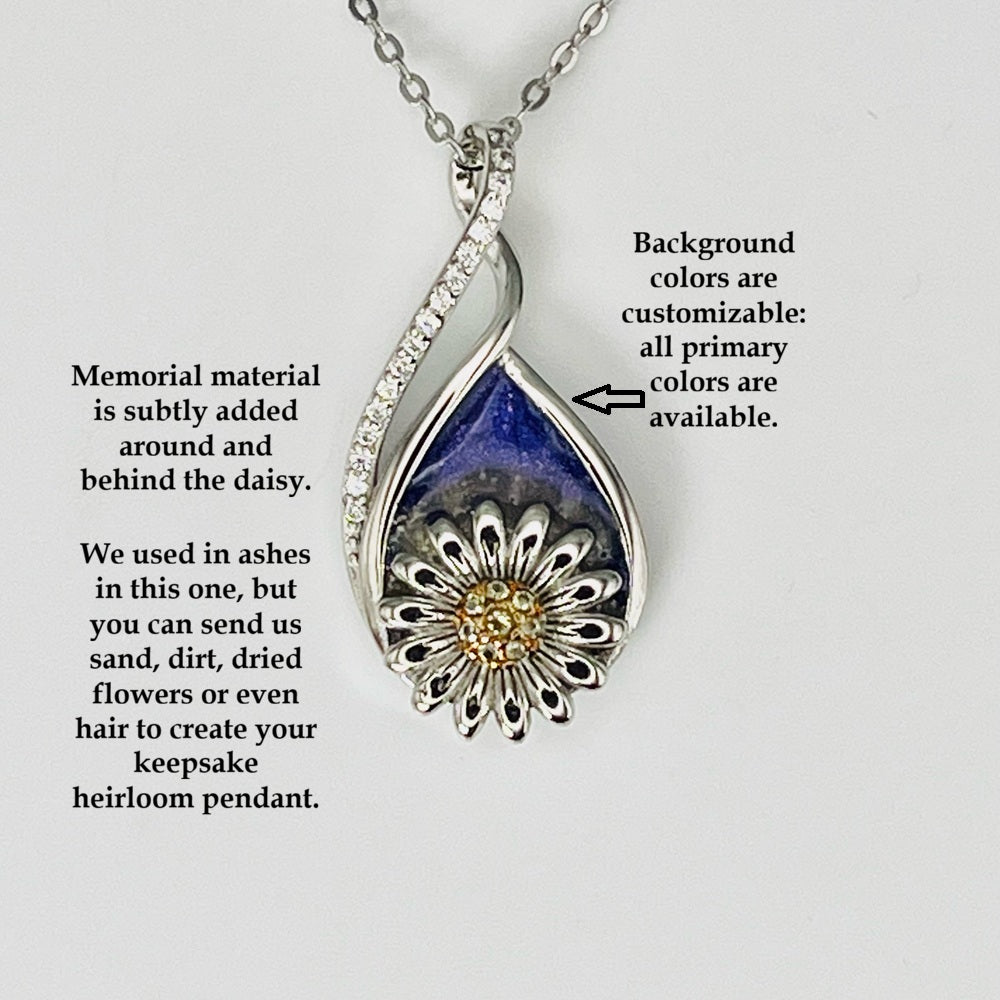 We will add your memorial material to the pendant so that the daisy is the primary focal point, but the memorial material with be visible around the daisy. We can use cremation ashes, soil, hair or fur, sand, or other other meaningful materials.