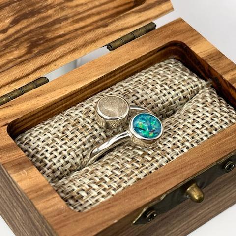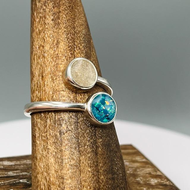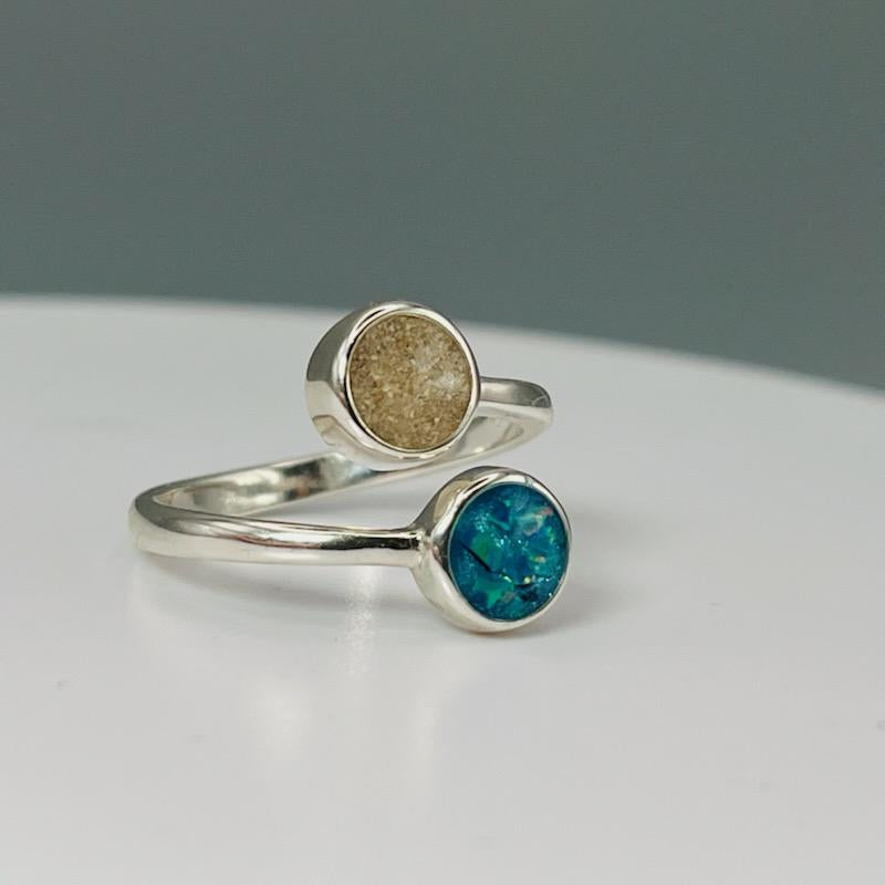 This adjustable sterling silver ring features two 8mm round cabochons. The cabochons are created to your personal preferences. In the primary photo is it shown with one cremation ash cab, and one cab created to symbolize December's birthstone.
