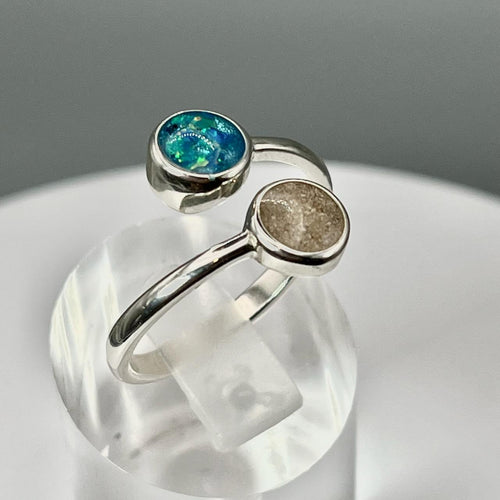 sterling silver wave ring made with ocean sand, white opals, blue opals and ashes