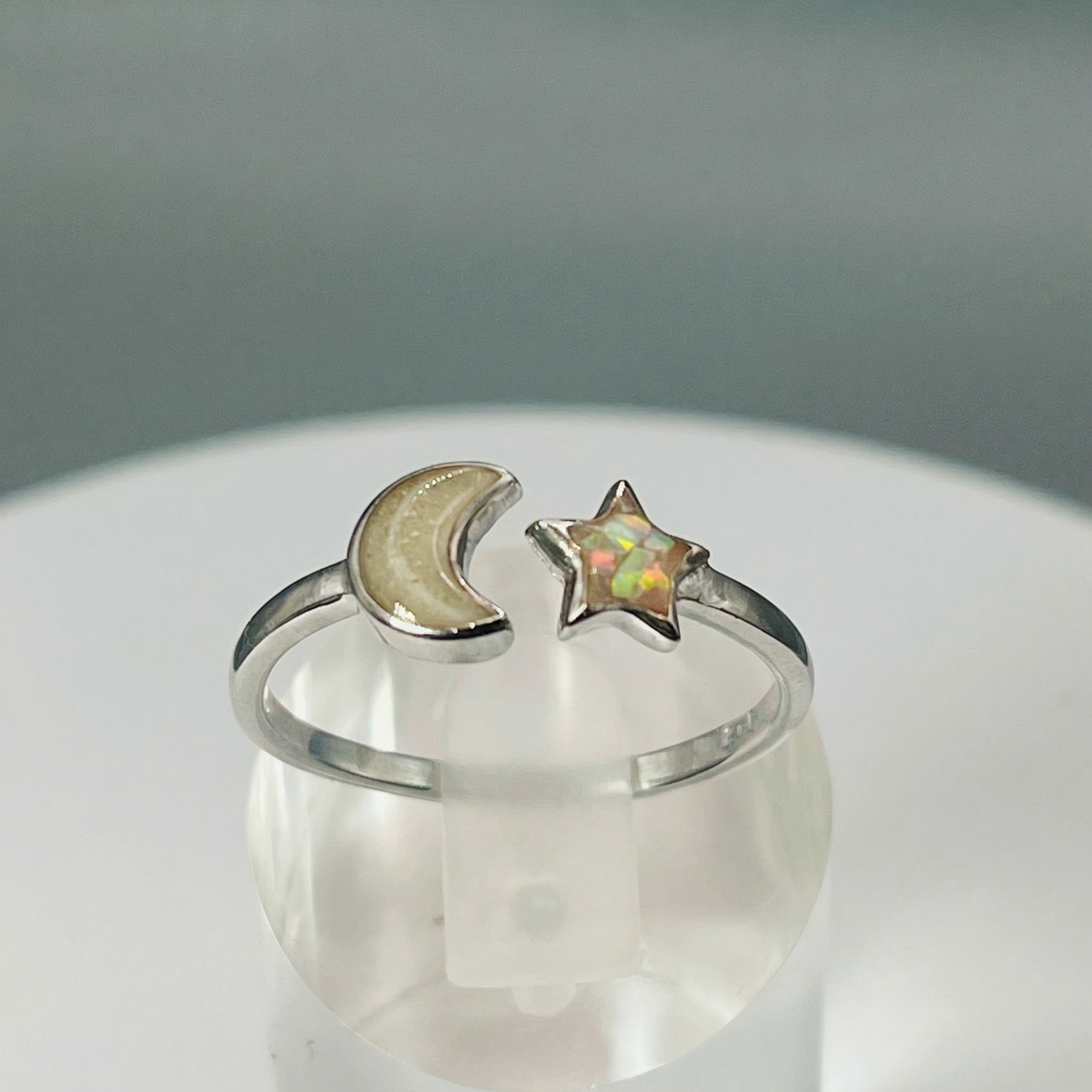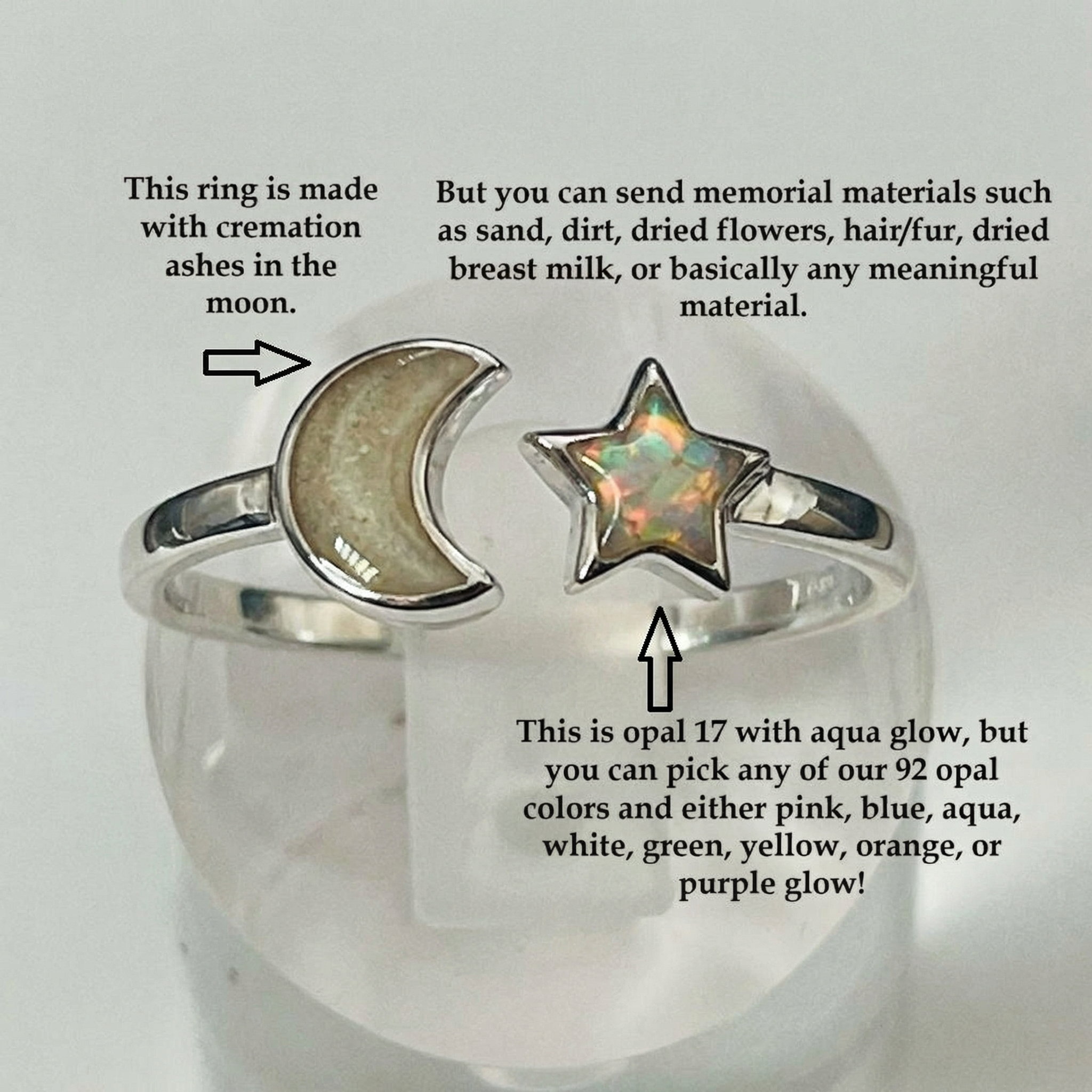 This delicate open-style .925 Sterling Silver ring features a crescent moon and star, handcrafted with your choice of memorial material plus opal and glow color accents. The ring shown here features cremation ashes with white glow and opal 17 with aqua glow. Please see photos of available opal colors and use the personalization box to tell me exactly how you want your ring to look.